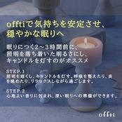 フランスの古城にある燭台のような、アンティーク風デザインのキャンドルホルダーです。 シックで穏やかなあかりが魅力です。普段はお部屋のインテリアとして。キャンドルのような質感の、溶けにくいハードワックス製です。アロマカップキャンドルを交換して、繰り返し使用できます。セット内容:ホルダー:1個 フレグランスカップキャンドル:4個 <アロマ:フルーティーブーケ> フルーツに、ジャスミン、スズラン、ローズとアンバーが香る、甘くフルーティーなフローラルの香り。 パッケージサイズ:横幅9cm ×奥行き9cm × 高さ18.5cm ホルダーサイズ:直径7cm ×高さ14cm 従来品に比べて点火時間が半分以下(※当社比)に短縮された「すぐつく」仕様です。 ※ホルダーは無香料です。※燃焼時間は使用状況や気温により異なりますので、目安にしてください。 ※短時間で点火・消火をくりかえすと、燃焼時間が短くなりロウも多く残りますので、点火後30分以上灯すことを推奨します。※危険ですので専用のフレグランスカップキャンドル以外は絶対に使用しないでください。※ホルダーはロウで出来ていますので、溶けることがあります。 offti(オフティ)は、自分らしさを取り戻す30分のオフタイムを届けます。