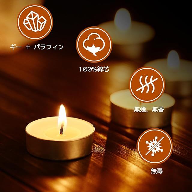 このティーライトキャンドルは、インテリアやギフトとして人気があり、リラックスした空間を演出するのに最適です。小さくて便利なサイズで、ティーポットウォーマー、アロマポットや装飾的なキャンドルホルダー、テーブルデコレーション、バスルーム、非常用照明など、さまざまな場面で活躍します。キャンドルの柔らかな光が心地よいひとときを提供し、手軽に雰囲気を変えてリラックスした空間を作り出します。