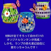 キットに材料が揃っておりおしゃれなモザイク風ランタンが作れる、女の子向けのDIY工作キットです。紫系タイルと蝶々リボンの可愛いデザインに加え、七色に光るLEDキャンドル付きで、夜でもキラキラ輝きます。箱入りなのでプレゼントにも最適!
