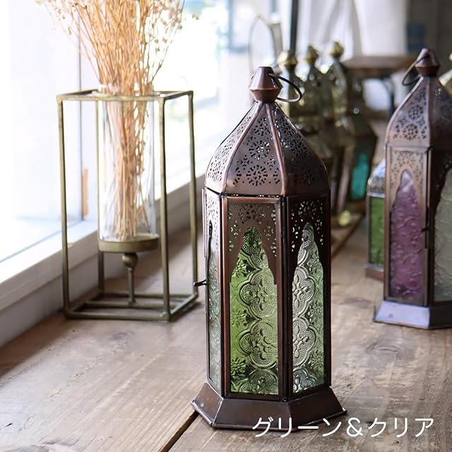 商品名:モロッコランタン キャンドルホルダー 高さ24cm 6面のレリーフガラス Morocco Lantern Candle holder (グリーン)