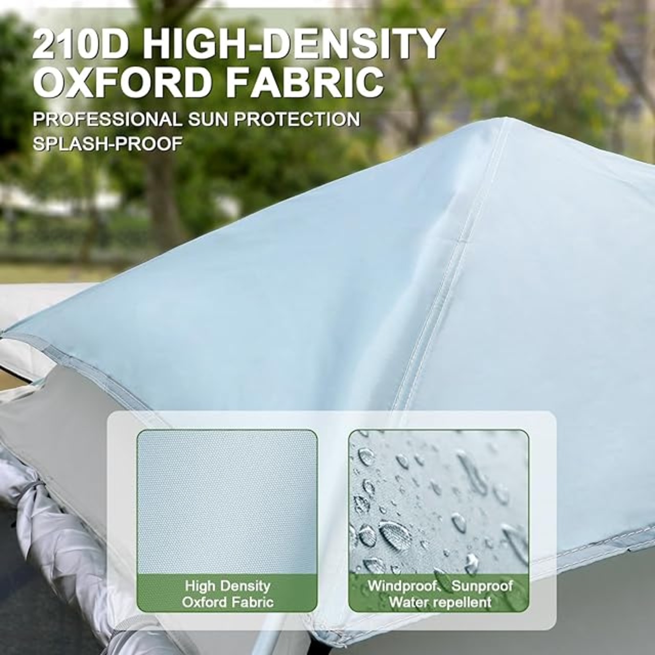 【210D銀コート生地でUV99%カット+耐水加工】高密度210D銀コーティングOXFORD生地を使用し、紫外線を99%遮断。さらに耐水加工で小雨も問題なし!暑い日も涼しく、突然の雨でも安心して使えるオールシーズン対応のテントです。