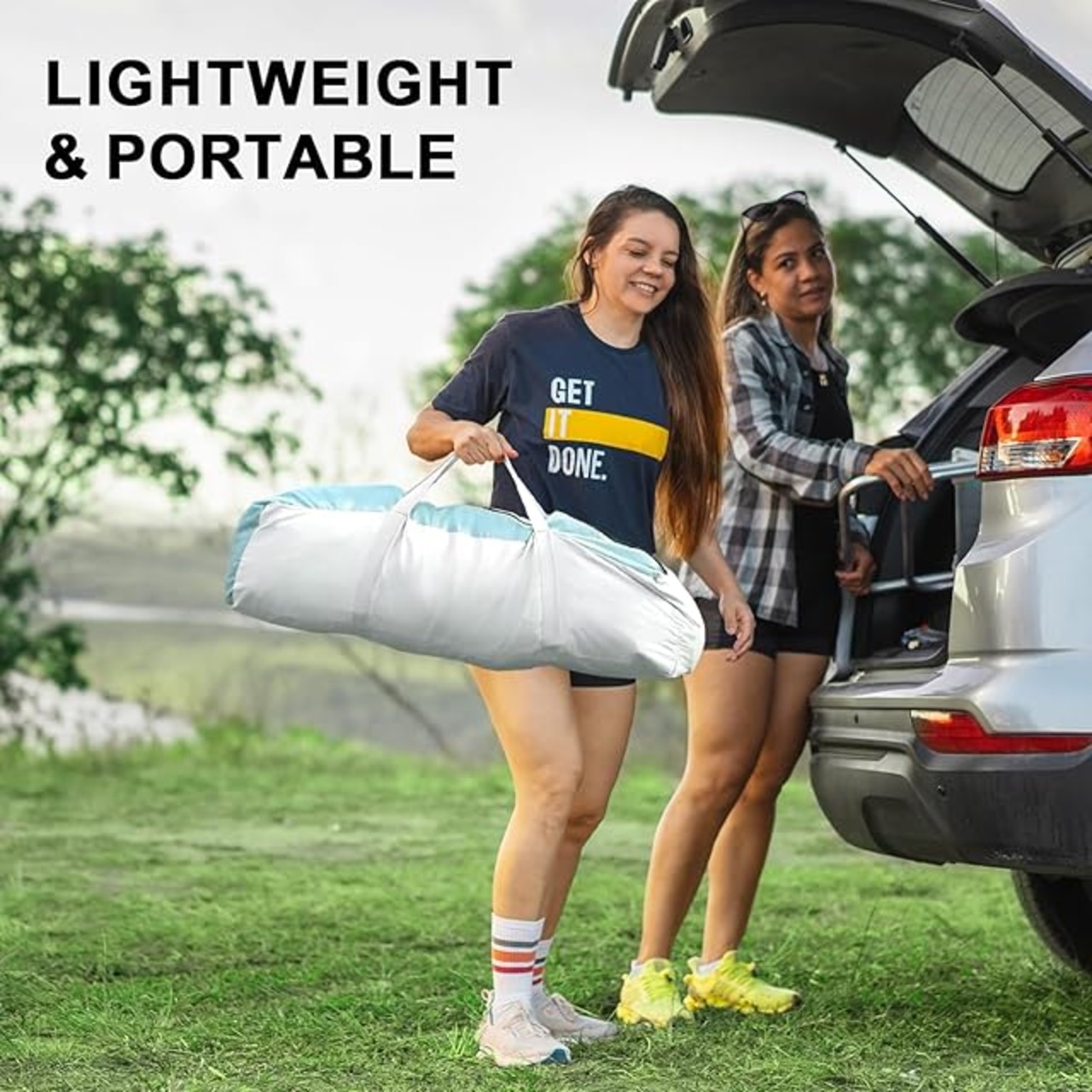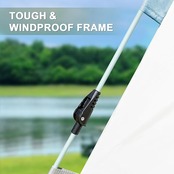 【強化フレーム+補強接合で台風級の強風にも耐える】高強度グラスファイバーフレームと補強接合部を採用し、強風でも倒れにくい頑丈設計。折り畳み時は直径60cm×厚さ10cmとコンパクトで、付属の収納バッグに入れて車やキャリーバッグで楽々運べます。