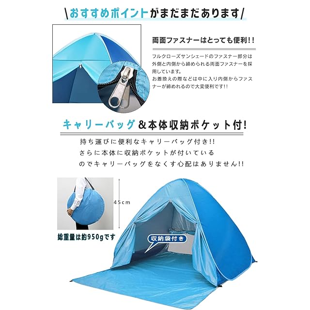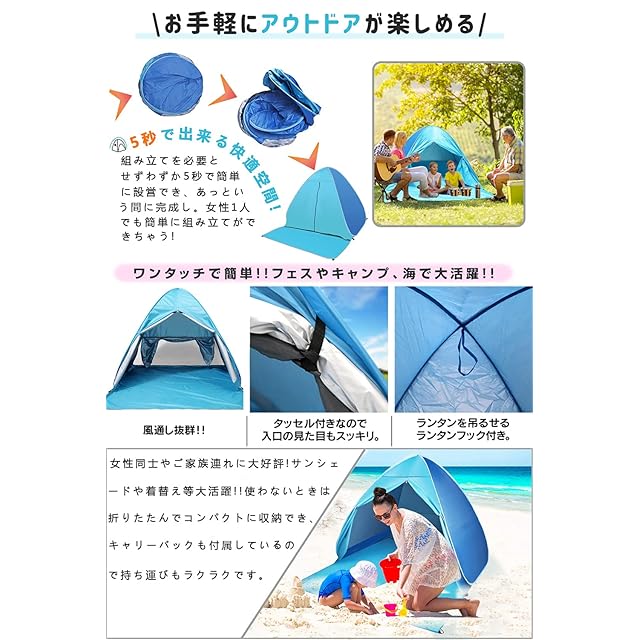 商品名:ポップアップテント ワンタッチテント 1人用 サンシェード 2-3人用 簡易テント 超軽量 通気 組み立て不要 公園/運動会/ビーチ日よけ 99%UVカット アウトドア用品 キャンプ 海 砂浜 プール お花見 釣り 防災 専用キャリーバッグ 日本語説明書付き
