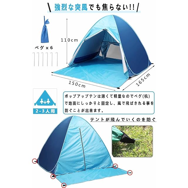 【商品セット】ワンタッチテント*1、ペグ6本、キャリバック*1。対応人数:2-3人(1名大人と2名子供あるいは2名大人と1名子供)。使用時(約):幅165㎝ x 奥行150㎝ x 高さ110cm。収納サイズ:45cm。