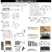 セット内容:テント本体x1、インナーテントx1、グランドシートx1、ポールx6本(ストレートポール×2本、長い曲がったポール×2本と短い曲がったポール×2本)、自在付きガイロープx12本(3.5mx4本、2.5mx4本、1.0mx4本)、V字型ペグx24枚、専用収納バッグx1となります。