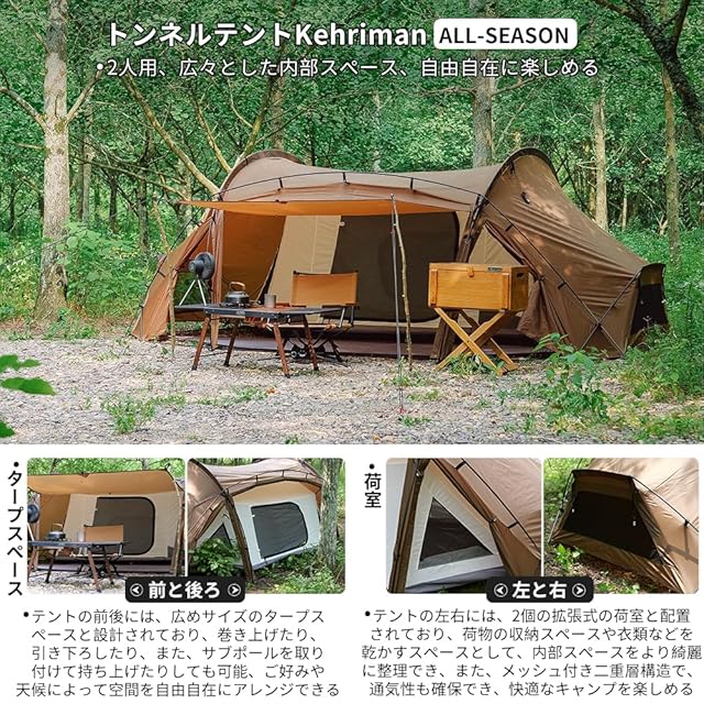 deerestトンネルテントkehriman2人用快適アウトドアキャンピン日除け風通し良い防風/防雨/UVカット/通気 家庭/カップルキャンプ適用アウトドア/キャンプギア