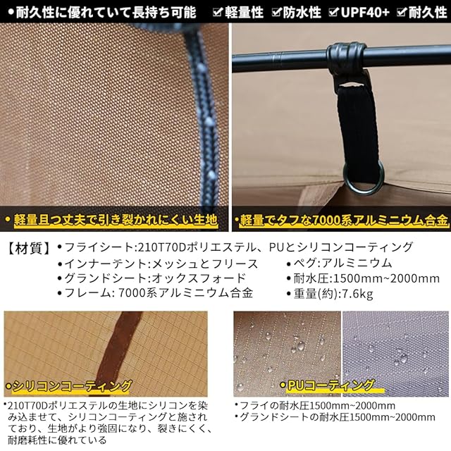 素材: テントの幕体生地は210T70Dポリエステルを採用し、縦糸と横糸が交互に交差する平織りと言う丈夫なイメージがある製法で編み上げた素材、また、生地にシリコンコーティングと施されたので、軽量性を維持しながら、より強固になり、風が吹いても引き裂かれにくく、防風性能を高め、耐磨耗性に優れていて長持ち可能です。生地にPUコーティング処理済みで、耐水圧は1500~2000mmとなり、小雨の場合ならご心配する必要は要りません。フレームは軽量でタフな7000系アルミニウム合金を採用、軽量で耐久性に優れています。グランドシートはオックスフォードを採用、PUコーティングが処理済みで、耐水圧は1500~2000mmとなります。ペグは頑丈で耐久性に優れたアルミニウムを採用となります。