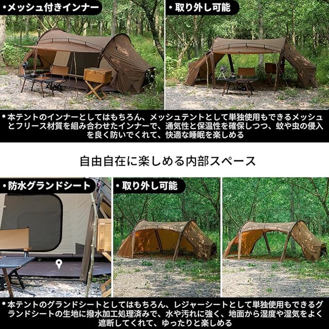 設営簡単:自立タイプで、6本のポールをスリーブの中に差し入れ、端末をコーナーグロメットに差し込んで完全に自立でき、インナーテントも吊り下げるタイプで、リングに結んでぶら下げるだけ、簡単に設営できます。