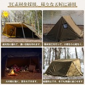 【耐久性、遮光性、難燃性】TC素材を採用している1パップテントで、耐久性、遮光性はもちろん、難燃性にも優れています。火の粉が当たっても穴も現れませんから、テントの下で焚火することもできる。スカートはオックスフォード生地で、燃えないように焚火する前にスカートを巻き上げて注意してください。撥水加工を行って、雨の日でも心配なくキャンプできます。TC素材の生地を使って、冬でも結露を防止できるポリコットンテントになります。