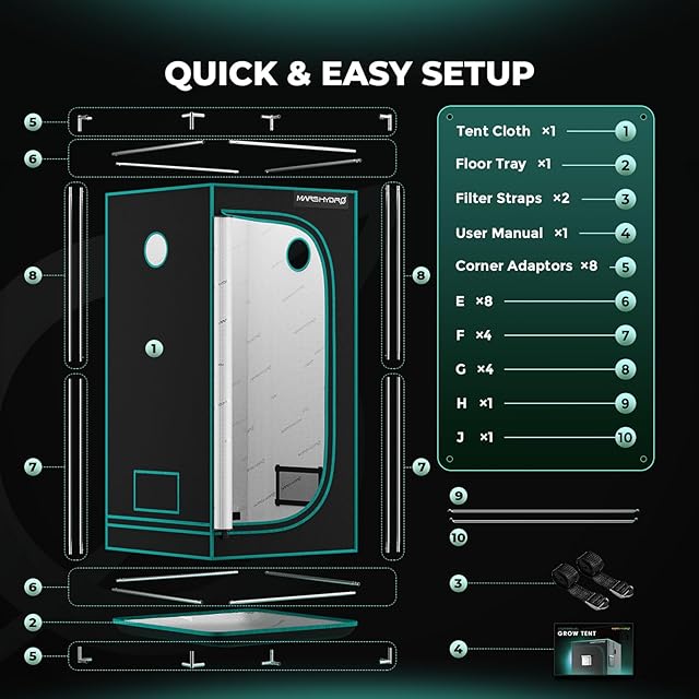 頑丈な金属構造と簡単な組み立て:安定した金属ポール、コーナーアダプター、トップバーで構成されたこの成長テントは、耐久性に優れ、錆びたり塗装が剥がれたりしません。厚く頑丈な鋼製ポールは、他の小型成長テントよりも多くの重量に耐えることができます。ポップスナップと穴を使った簡単な組み立てで、水耕栽培やガーデニングの成長セットアップを数分で迅速に構築できます