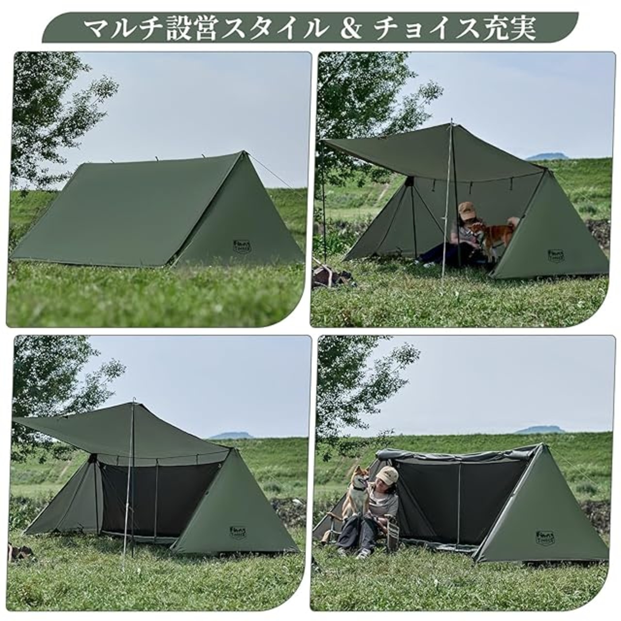 【自在変形&虫対策】「半開放式」や「完全密閉式」など多様な形態にパップテントを切り替えられます。着脱式のメッシュインナーテントが、虫の侵入を防ぎ、ソロキャンプをより快適にします。