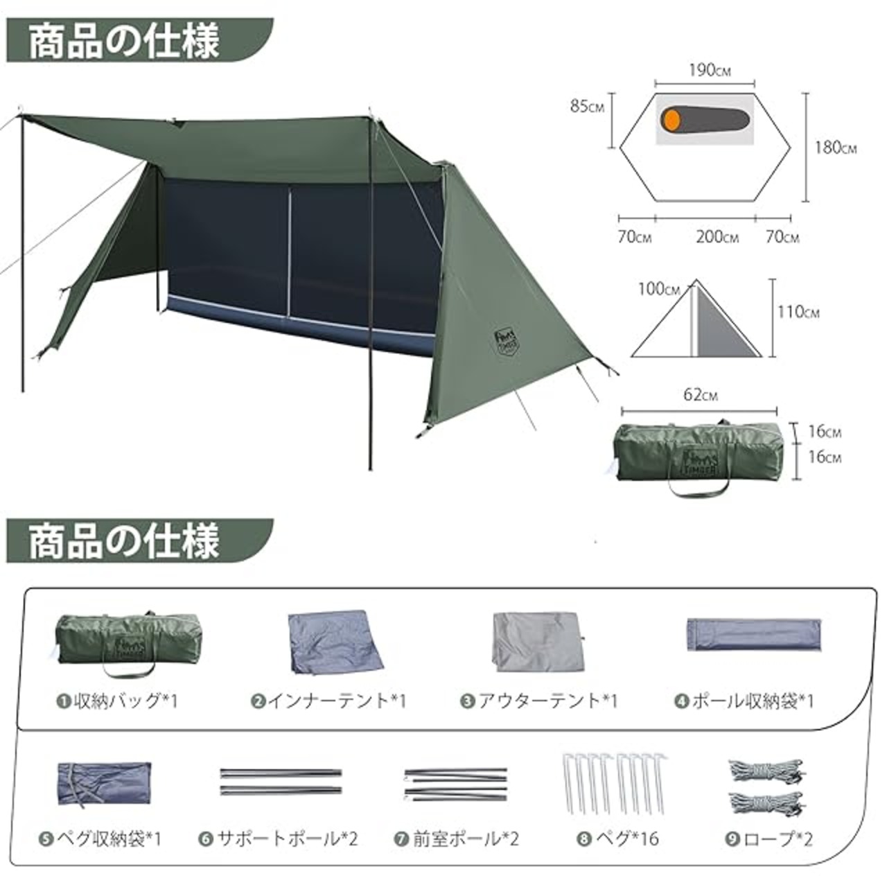 商品名:TIMBER RIDGE ソロテント パップテント 1人用 軍幕テント 軽量 約4kg 簡単設営 UVカット加工 コンパクト収納 耐水圧 防風 防水 通気 日よけ キャンプ用 アウトドア