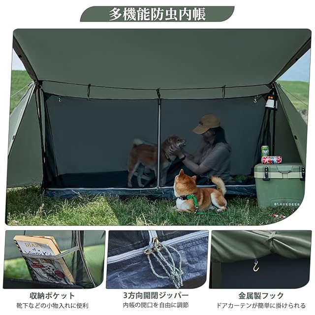 【思いやりのあるデザイン】:①、滑り止め加工でサポートポールをより安定させます。②、反射糸付きガイロープで夜間の視認性を高めます。③、ランタンフックは夜間照明に便利です。④、フットロープでアウターテントの張り具合と風通し調節を同時にできます。