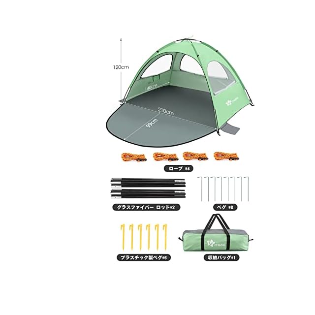 商品仕様・付属品カラー:ベビーパウダー、ミントグリーン、スカイブルー、グラスグリーン、オフホワイト。サイズ:(約)幅210cm×奥140cm×高さ120cm 。収納サイズ:(約)幅45cm×奥13cm×高さ13cm。重量: (約)1.8kg、テント生地:190Tポリエステル生地とオックスフォードクロス、UVカット率:UPF50+ 、付属品:収納袋 *1、ペグ *8、プラスチック製ペグ *6、ロープ *4、グラスファイバー ロッド *2