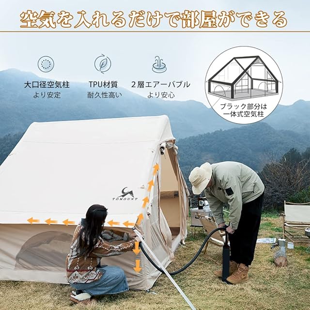 商品名:TOMOUNT インフレータブルテント エアーテント 6㎡ 300Dオックスフォード ロッジ型 2~4人用 煙突穴付き ファミリーテント キャンプ 組立簡単 アウトドア 遮熱 耐火 防蚊虫 4シーズン 収納袋付く