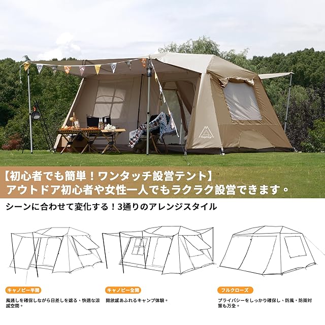 【数秒で設営完了!ワンタッチ構造】✅ 伸縮式フレームを採用した一体型構造で、誰でも簡単・スピーディーに設営可能。フレームを広げるだけでわずか数秒でセットアップ完了!前室用ポール3本も付属しており、追加購入不要。キャンプ初心者や女性の方にもおすすめです。