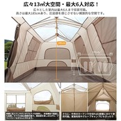 【広々13㎡の開放空間&抜群の通気性】✅ 設営時サイズは約395×270×185cm、最大6名まで対応可能。ロッジ風の構造により、ゆったりとした居住空間を提供します。両サイドにドア、合計6つの窓を配置し、すべてにメッシュが付いて虫の侵入を防ぎながら換気性も確保。中央のカーテンで空間を2部屋に分けることも可能です。