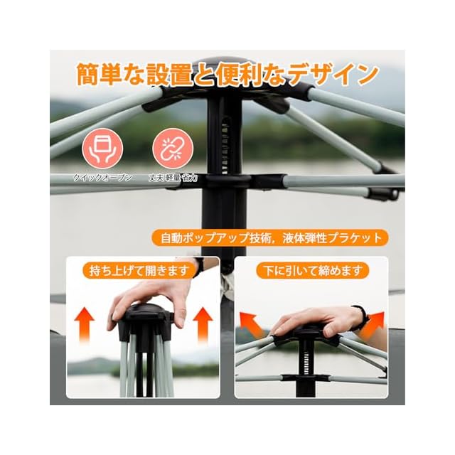 【ワンタッチ設営】このワンタッチテントは誰でもたった3秒で設営でき、初心者や女性でも簡単にお使いいただけます。優れた設計により、災害時の避難所としても最適で、安全かつ快適な空間を提供。遮光・遮熱効果により日焼け防止と肌への優しさを実現し、3~4人収容可能なため、多くのお友達や大家族と自然の中で贅沢な時間をお過ごしいただけます。
