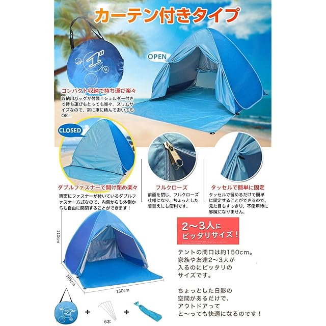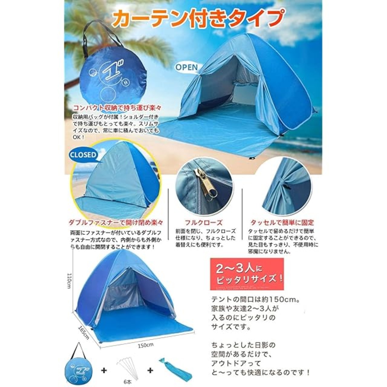 商品名:ポップアップテント テント ワンタッチテント 簡易テント ワンタッチ 1人用 サンシェードテント 2-3人用 軽量 屋内 用 テント 運動会 テント 通気性 アウトドアビーチテント ワンポールテント UVカット 防災 キャンプ用品ブルー)
