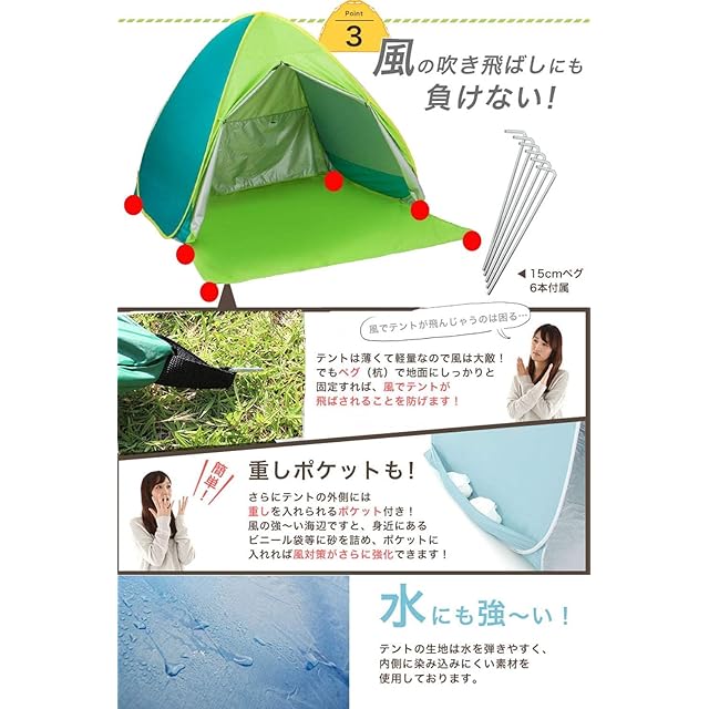☀【風通し抜群、ペグ6本付でより強いです】テント背面は通気性を確保するために、窓はメッシュ構造を採用しており、効果的な換気が行え、蚊などの害虫の進入を防ぐことができます。ペグ6本-超規格鉄線製のフレームを採用して、耐久性が良いです。ビーチや公園など風の強い場所でもめくりあがる心配がありません。両側にある大きなポケットが付きため、水を置くことで、より安定します。