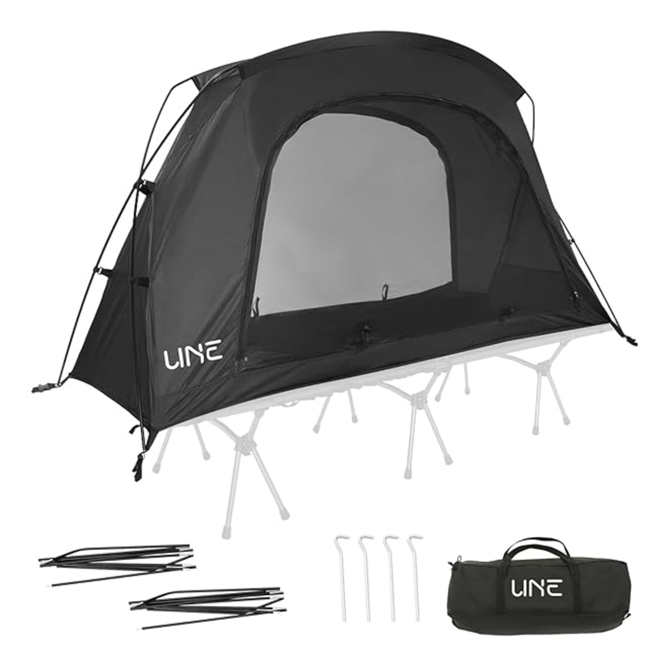UNE キャンプテント 1人用 3wayタイプ 前後出入り口 190x65x100cm 通気 防雨 自立式コットテント ソロ 軽量 収納が簡単 組み立てが簡単 single camping tent テントペグ/収納袋付き ハイキング/キャンプ/防風避難/防災用 黒