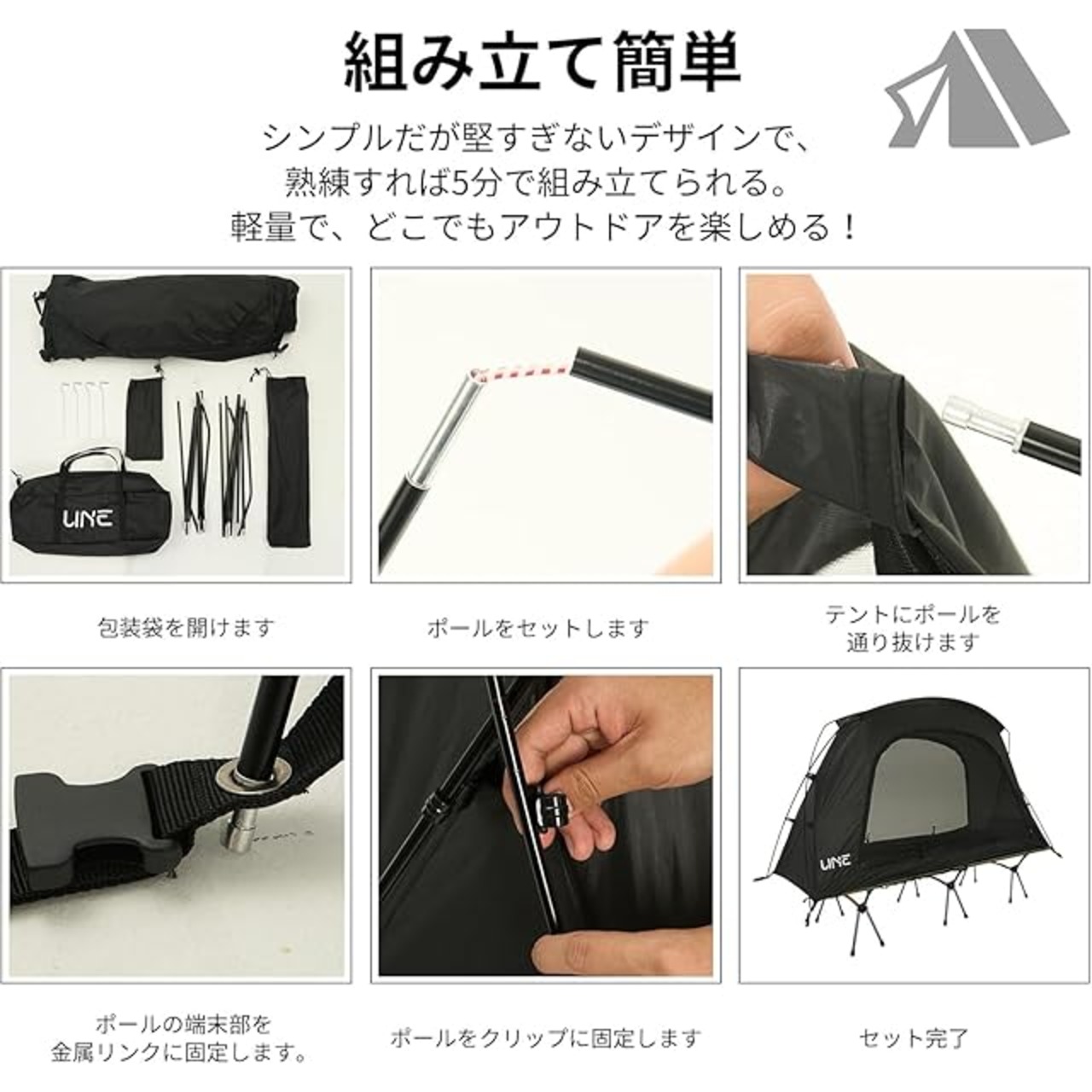 商品名:UNE キャンプテント 1人用 3wayタイプ 前後出入り口 190x65x100cm 通気 防雨 自立式コットテント ソロ 軽量 収納が簡単 組み立てが簡単 single camping tent テントペグ/収納袋付き ハイキング/キャンプ/防風避難/防災用 黒