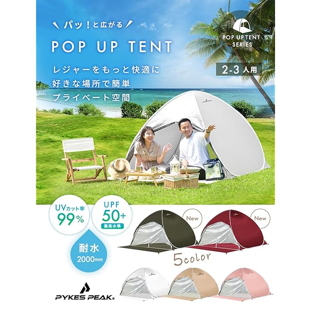【イマドキカラーでお洒落にレジャーを彩る2~3人用ポップアップテント】 ビーチやピクニックなど、様々なレジャーシーンで映える明るいカラーのテントがアウトドア用品のニュースタンダードとして登場! 本製品の特長は、なんといってもアウトドア用品には珍しい「5色のカラーバリエーションと製品に兼ね備えられた高い機能性です。 「長く使う物だからこそ、充実の機能性でお洒落なアイテムを選びたい!」そんな皆さまの声を実現しました。 組み立ても片付けも時間がかからず、暑さや風対策はもちろん、高い防水&透湿性も持ち合わせた”優れモノ”な製品です。 2~3人用のテントですので、大切なご家族やご友人というような多人数のお出かけ用に、または今人気のソロキャンプ用やおうちキャンプ用など、大人からお子様までお好みの使い方が叶います。