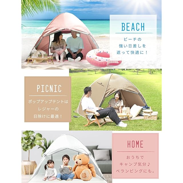 【組み立てがシンプル&スピーディー】 とことん使いやすさを追求し、テント組み立てに掛かる時間と煩わしい手順を大幅カット!専用ケースから取り出して手を放せば、5秒でぱっとテントが自動的に開きます。また、簡易シートも本体と一体になっているのでわざわざレジャーシートなどを敷く必要がありません。
