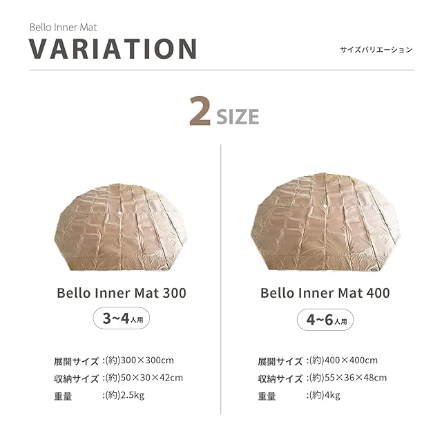 ●素材には5mmパールコットンを使用しているので冷気や湿気を遮断させたり地面の凹凸をさらに軽減するなどテント内での睡眠や過ごす時間をより快適にしてくれます。 ●テント底面の内側コーティングを保護してくれてテントへのダメージを抑え、長くご使用いただけます。 ●「bello300」「bello400」使用可能