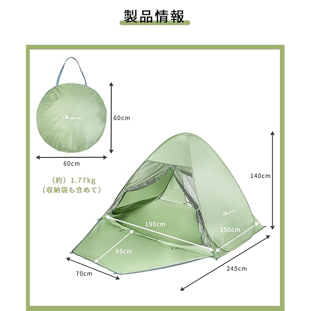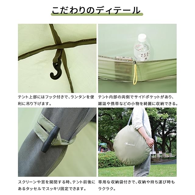 【魅力的なディテール】 1、前後メッシュ構造:メッシュのドアと窓を搭載し、夏場でも快適。虫の侵入も防ぎつつ、風通しバツグン! 2、UVカット&防水:紫外線から肌を守るUVカット仕様!さらに1000mmの耐水性能で、小雨でも安心。 3、ピクニックマット一体型:テントの入口には広めのピクニックマットが付属。レジャーシートを別途用意する手間なく、快適にリラックスできる。