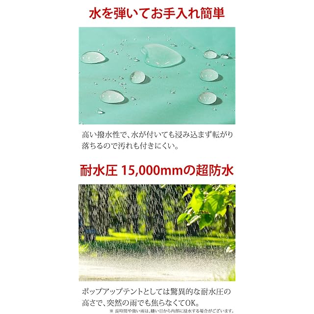 耐水圧 15,000mmの超防水ポップアップテントとしては驚異的な耐水圧の高さで、突然の雨でも焦らなくてOK。 ※ 長時間や強い雨は、縫い目から内部に浸水する場合がございます。