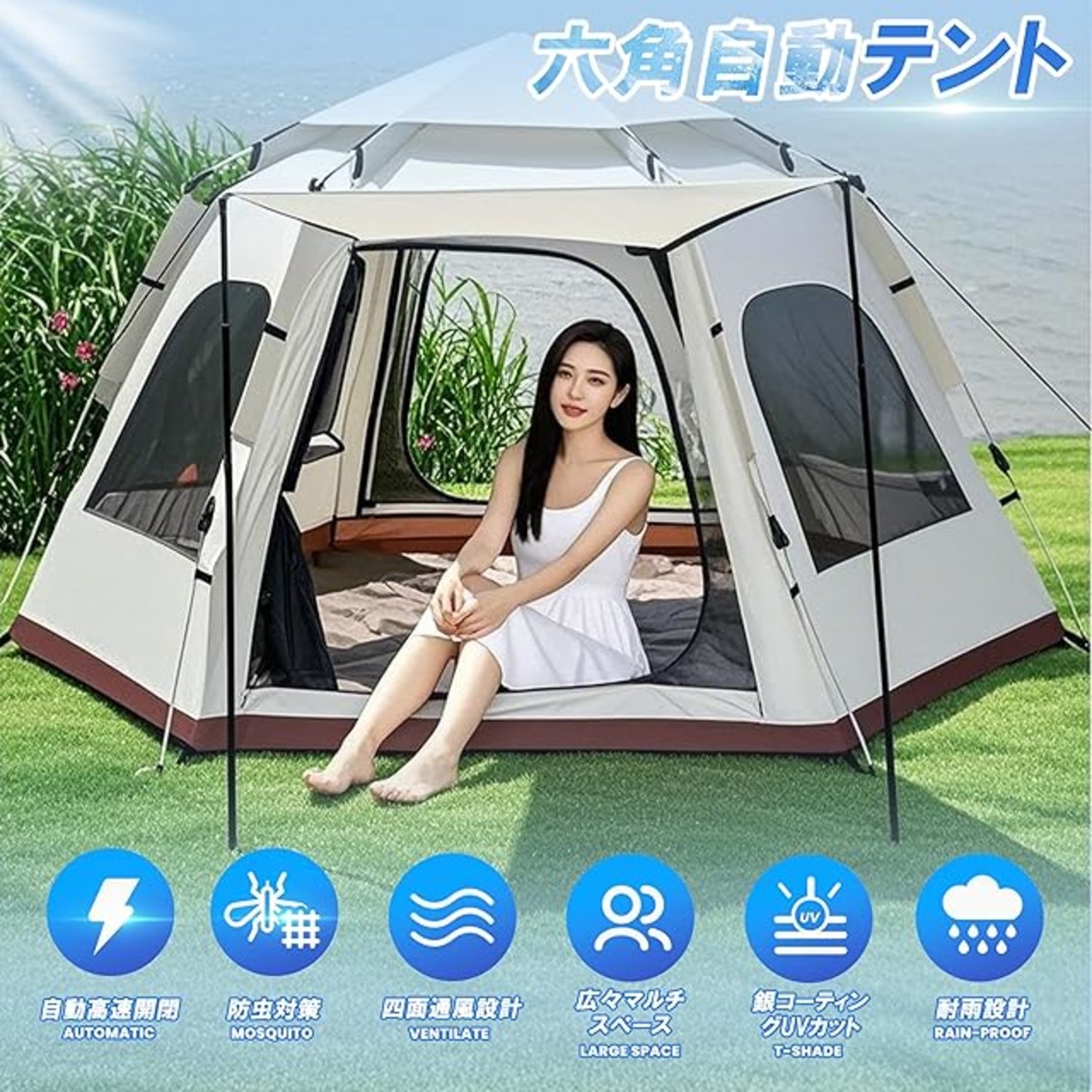 商品名:Haikawi ワンタッチテント キャンプテント 新六角形テント 5-6人用 折りたたみポール付き 収納袋付き 持ち運び便利 組立て簡単 折りたたみ 前室ポール付き 2ドア4窓 通気 設営簡単 自立式 UPF50+ 紫外線対策 高耐水 防風防水 撥水加工 キャンプ用品 緊急用 防災用