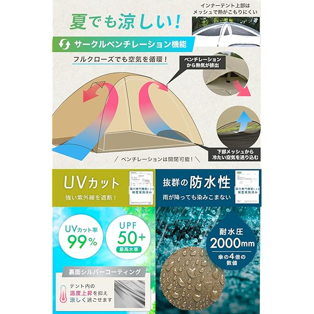 ✅【抜群の紫外線カット / 雨水を通さない防水性】生地には耐久性に優れた190Tのポリエステルを採用!裏面には遮光性を高めるシルバーコーティングが施されてるため、日焼けの原因となる紫外線を99%カットし、紫外線遮蔽率はUPF50+を実現。いかなる天候にも耐え、色あせやひび割れ、摩擦に強く、強度、耐久性を備えています。【耐水圧2000mm】テントの性能を表す耐水圧は大雨に耐えられる2000mmもあるので、急な雨や夜露で生地が濡れる心配もありません。また通気性もよく、湿気は適度に外に逃すため、悪天候対策と快適な居住空間の確保を同時に叶えます!