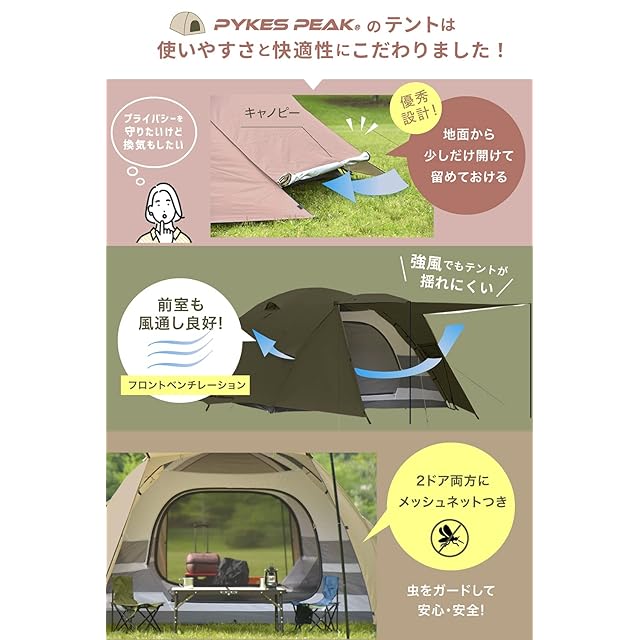 ✅【大自然の中でみんなで過ごす。最高に癒される一日を】大自然の中でみんなで過ごすことで最高に癒される一日を満喫!【ビッグサイズテント】大好評のPYKES PEAK(パイクスピーク)ドームテントシリーズから待望の新商品が登場!”より快適により充実した”キャンプを楽しんで頂けるよう細部にまでこだわりました。家族みんなでゆったり忘れられない思い出作りに、仲間とわいわい大自然で憩いのひと時を過ごすのに最適なビッグサイズテントです。✅【自然に溶け込む4カラー】キャンプの醍醐味である大自然との触れ合いを意識し、植物や大地のイメージしたナチュラルカラーを採用。オリーブグリーン/アプリコットベージュ/サンドカーキ/ブラックと4種類用意しているので、季節や使うシーン、お好みに合わせてお選びいただけます。さらに、タープとセットで使えばおしゃれ度も一段とアップ!