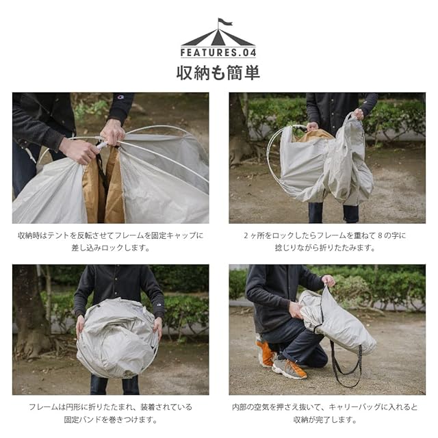 【メッシュ・モスキートシート/多機能】テントフロント対面2ヶ所のシート扉のインナーはメッシュシート仕様。視界と通気性の確保と害虫除けの網目が細かいモスキートシート。テント上部は内部の熱気を排出するベンチレーション(通気)スペースがあり、その上部にはトップシートで覆われて雨漏れを防ぎ、換気を促す構造です。フロント、メッシュシートはダブルファスナー仕様で内外両側からできて便利です。巻き止めできるタッセルで固定ができます。テント上部にはランタンやライトを吊るすループフック付き。収納時は円形に折りたたむ収納式。約Ø60*t2.5㎝に収納。重量は約1.4kgの軽量タイプ。持ち運びやすいキャリーバッグが付いています。車に積み込みやすくトランクの荷物が多い時でも安心です。