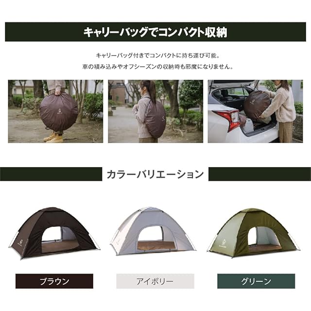 【メッシュ・モスキートシート/多機能】テントフロント対面2ヶ所のシート扉のインナーはメッシュシート仕様。視界と通気性の確保と害虫除けの網目が細かいモスキートシート。テント上部は内部の熱気を排出するベンチレーション(通気)スペースがあり、その上部にはトップシートで覆われて雨漏れを防ぎ、換気を促す構造です。フロント、メッシュシートはダブルファスナー仕様で内外両側からできて便利です。巻き止めできるタッセルで固定ができます。テント上部にはランタンやライトを吊るすループフック付き。収納時は円形に折りたたむ収納式。約Ø60*t2.5㎝に収納。重量は約1.4kgの軽量タイプ。持ち運びやすいキャリーバッグが付いています。車に積み込みやすくトランクの荷物が多い時でも安心です。
