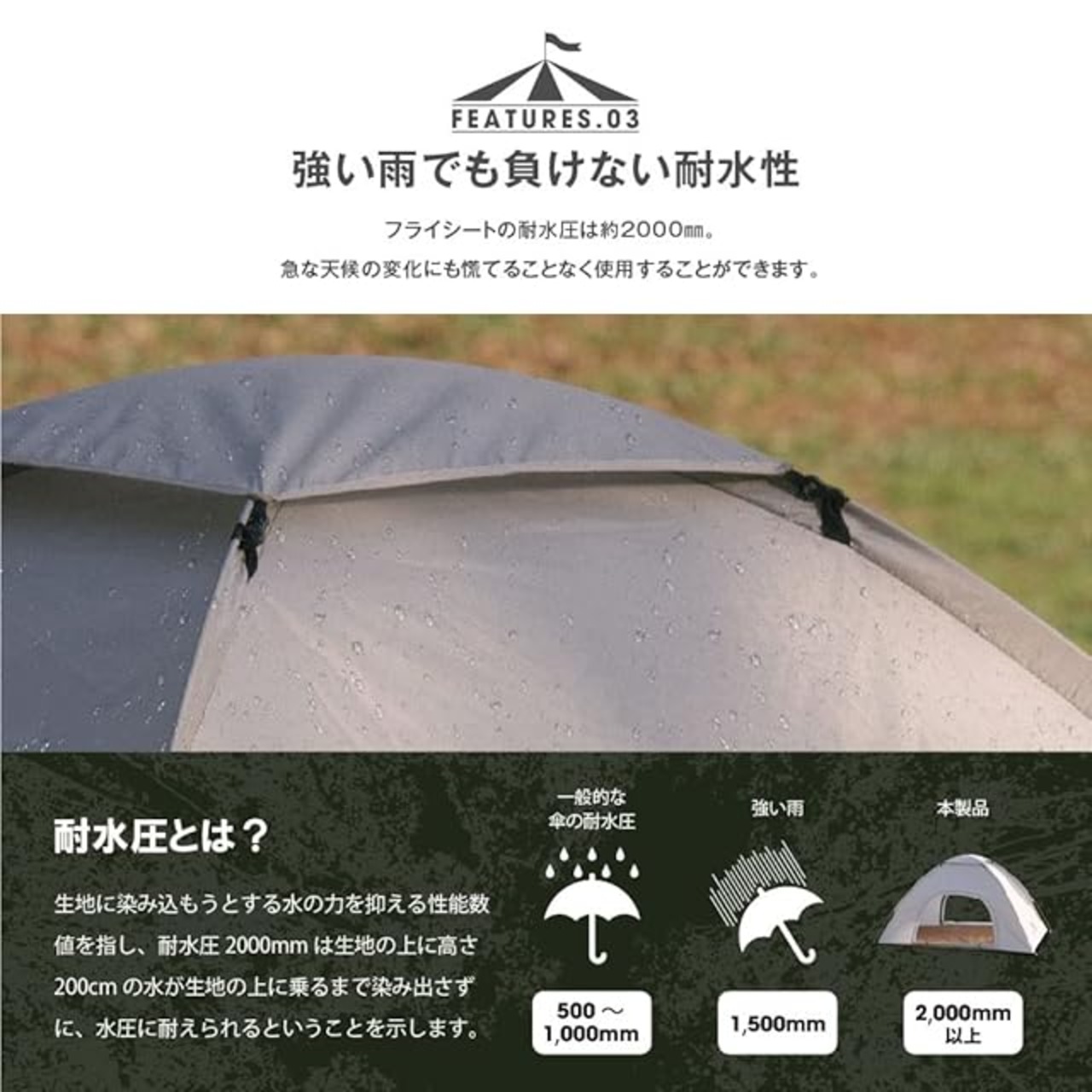 【オックスフォード織 / 耐久性、耐熱性、防水性、UVカット】テントシート素材はポリエスレルのオックスフォード織。柔らかい手触りと強度があります。オックスフォード織は気孔が多く、厚地ですが通気性に富んでいて夏場には最適です。さらにシート裏面にはUVシルバーコーティングが施され、遮熱性、遮光性に優れ、UVカットは世界基準UPF50+の最大99%カット値を認証されています。また、耐水圧2,000㎜の高い防水性があり、荒天に配慮された安心なテントです。