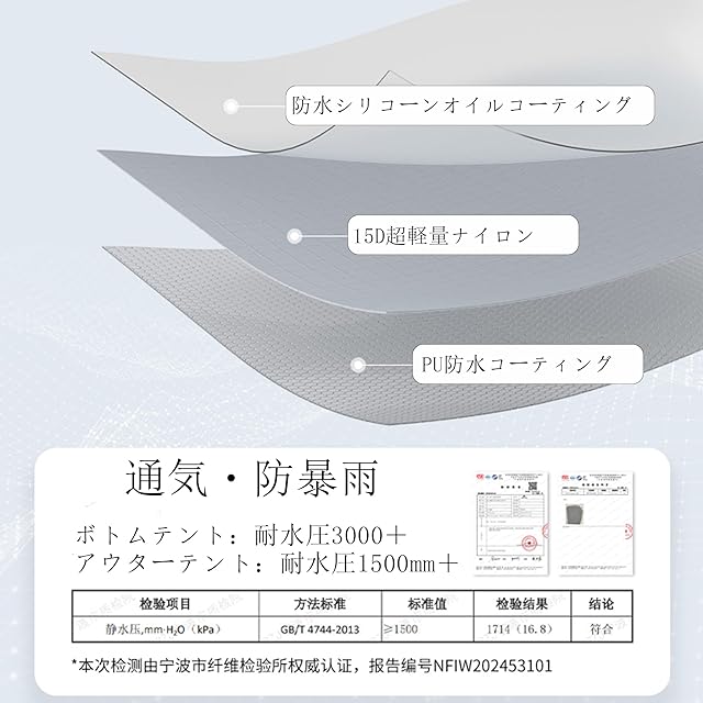 【より大きくしても、設営がまだ速め】快適は疲れを消す事にとって最も重要なことです。それで、cloudupは快適程度をアップするために、色んなデザインを採用しました。広がれたドア高度はテントの中に正坐しても頭がテントと当てらせません。ダブルY型のポール構造で、各種のシーンでも快速に設営できます。側面に鳥翼設計を使用し、結露を防止できます。通気窓の存在はテントの中に空気の対流を形成して通気がない問題をよく解決しました。また、頭部の睡眠区に通気布を増加し、防風を実現してより良い睡眠体験を営造できました!