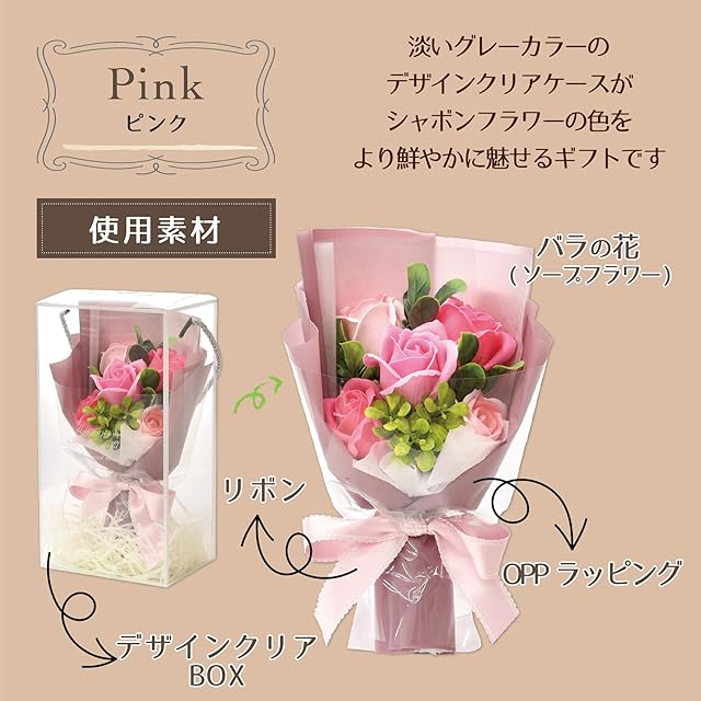 ポピー名古屋 ソープフラワー シャボンフラワー 造花 ギフト プレゼント 5輪ブーケ バラ 花束 約25cm クリアボックス付き SH-048 ピンク