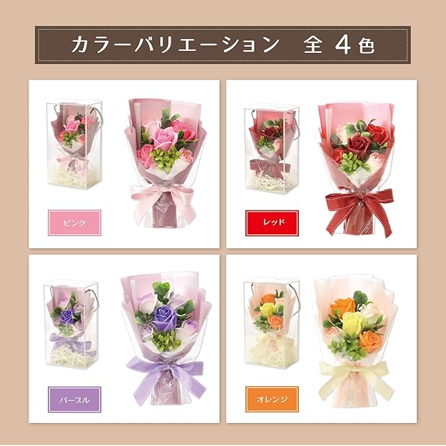 【ソープフラワーの特徴】花びら1枚1枚が石けん素材で作られた観賞用のお花です。プリザーブドフラワーと比べて花弁が大きく、値段がお手頃、石けんのいい匂いがふんわりと香るので人気があります。 生花のように水やりやお手入れの必要がなく、枯れる心配も虫や花粉の心配もありません。