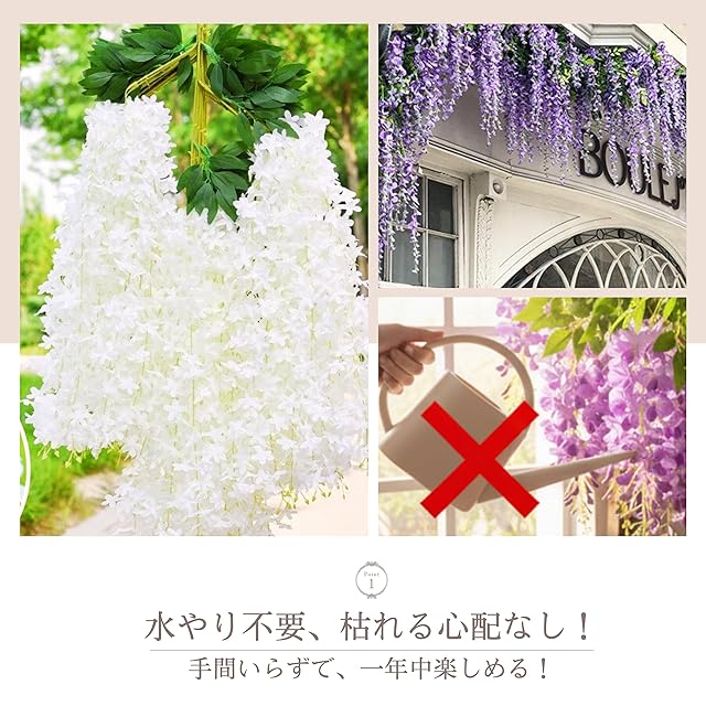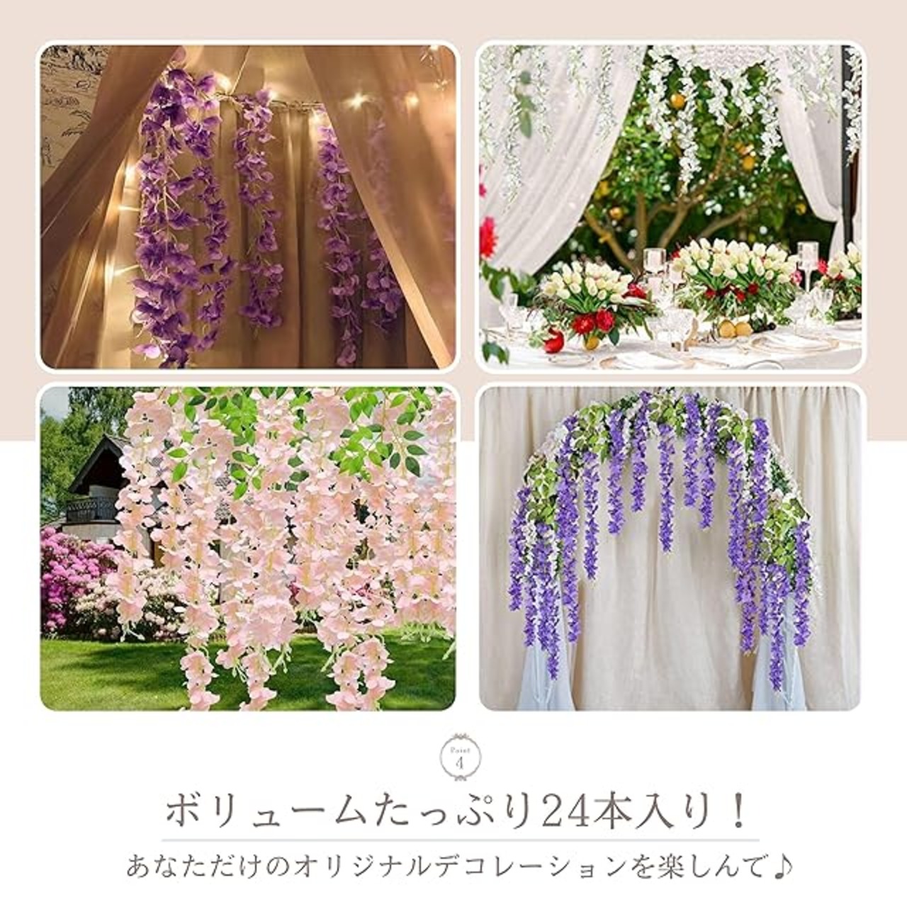 ガーデンデコレーションや結婚式飾り:結婚式、ホームデコレーション、オフィスデコレーション、ベランダ飾り、施設や学校のイベントの飾りとしても使える造花グリーン。つるタイプの藤の花が、どんな場所でも自然でエレガントな雰囲気を作り出します。人工なので、手入れ不要で長持ちするのも魅力的な造花インテリアです。