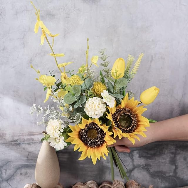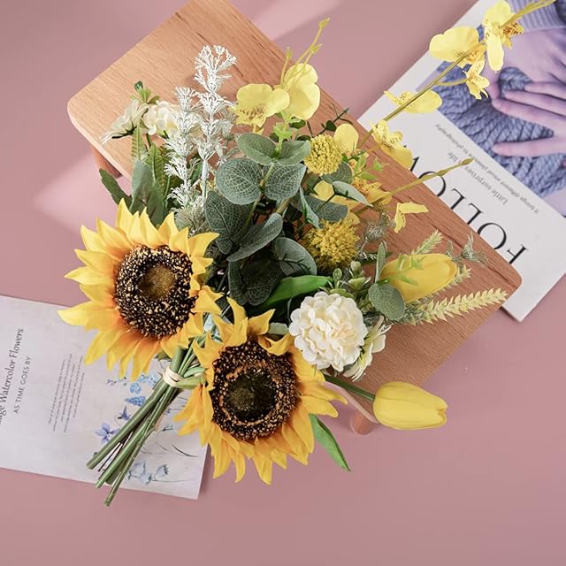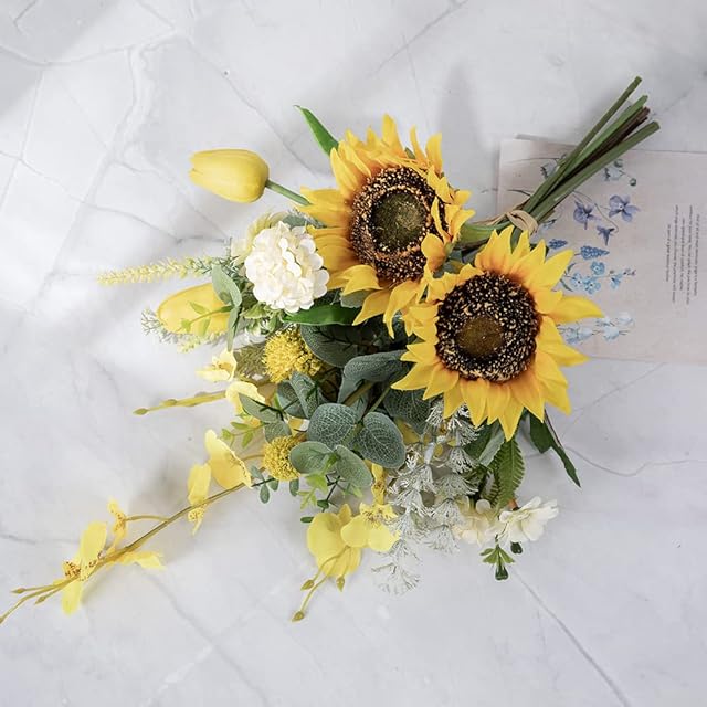 WillingYou オリジナルブーケ 造花 花束 観葉植物 インテリア お花 ギフト 送別会プレゼント 父の日 ひまわり チューリップ ユーカリ 1束