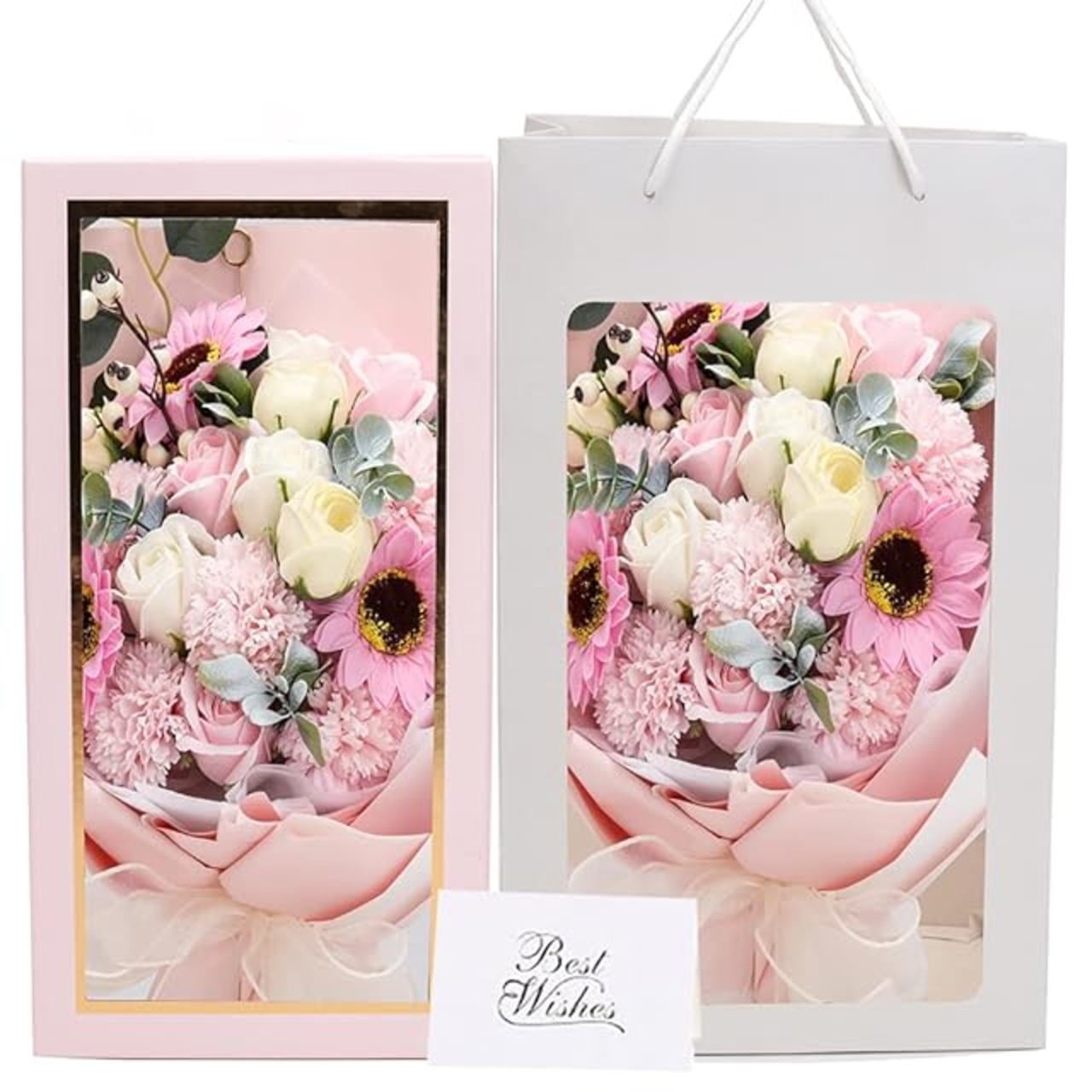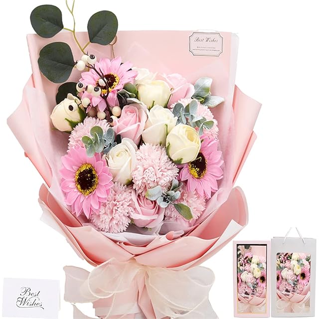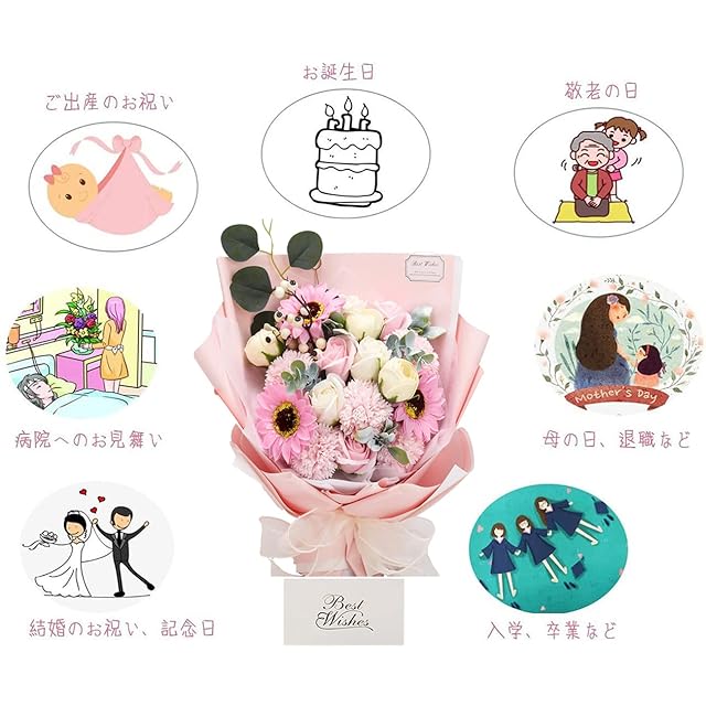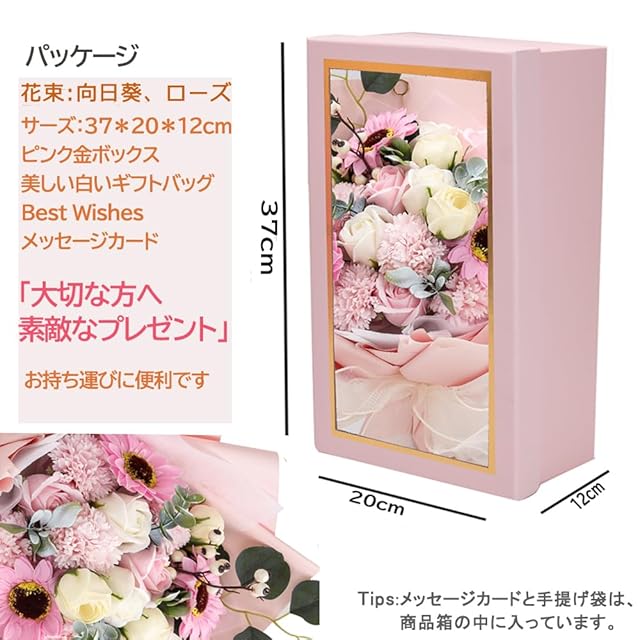 ✿【大人気なソープフラワー 】:ソープフラワーは花びら一枚一枚が香りのよい石鹸からつくられた、ほのかに香る観賞用のお花です。生花と違って水やりの必要もなく枯れることがありません。ブリザードフラワーとも違ってほのかな香りを楽しめます。花粉等も無いためアレルギーの原因となることもありません。アイディアに満ち溢れ、柔らかな質感、鮮やかな色合いと雰囲気を長い間お楽しみいただけ、彼女、奥様、母の日のプレゼント、誕生日プレゼント、結婚祝い、卒業式など様々なシチュエーションにピッタリです! 感謝やお祝いの事の贈り物として目を引くおしゃれグッズです。