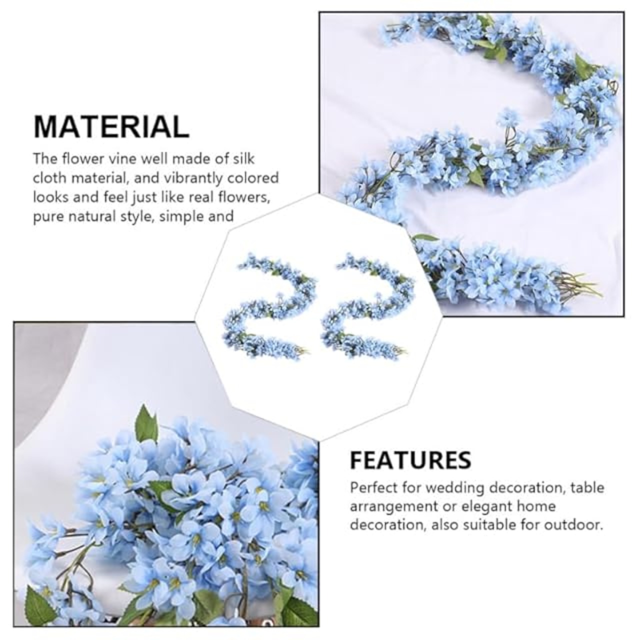 <b>パッケージリスト</b><br /> 造花つる 2 本<br /><br /><br /><b>特徴</b><br /> - 色: スカイブルーのアジサイ。<br />- サイズ: 170.00x5.00x5.00cm/66.81x1.97x1.97インチ屋外用造花。<br />- 素材: シルク布の花。<br />- 長くて明るい色の花のつると緑の葉が自然な外観を作り、良い気分を保つことができます造花のつる。<br />- 壁、ドア、窓、鏡などお好きな場所に吊るしたり巻き付けたり、ナチュラルスタイル、ゴージャスでエレガント、お手入れが簡単なグリーンインテリア。<br />- これらの人工吊り花つるは、自宅、結婚式のアーチ、吊り下げフープ、セレモニーアーチ、オフィス、ホテル、バーの装飾などの花つるの庭の装飾です。<br />- 花は豊かで豊かで、明るい色、葉の質感は明確で、葉の光沢のある表面は花の結婚式の装飾にぶら下がっています。<br />- まるで の花のような見た目と感触。美しくエレガントな人工籐の花、 のシルク布素材で作られており、すべての花は柔らかく、自然な見た目の造花です。<br /><br /><b>商品説明</b><br /> 家庭用装飾もできます。壁、ドア、ブランコ、鏡など、好きな場所に人工つるを使って楽しむことができます。花つるの庭の装飾完璧な花つるのウェディングアーチを作りたいですか?大切な日をこの花蔓のように美しくしましょう!花のつるを使ってケーキの背景を飾ったり、パーティーのレセプションを飾ったり、テーブルのセンターピースを花のつるで飾ったりすることもできます。