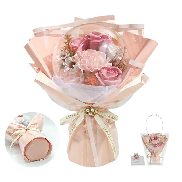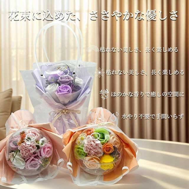 <p> <b>豊富なカラーバリエーション</b><br> ピンク・パープル・レッド・イエローの4色展開。贈る相手やお部屋の雰囲気に合わせて、お好みのカラーをお選びいただけます。</p> <p> <b>自立式バルーン型デザイン(アクリル素材)</b><br> 台座付きで安定して自立。花瓶いらずで、そのまま置くだけで華やかに飾れます。アクリル素材のバルーン型デザインが、インテリアに上品な存在感をプラスします。</p> <p> <b>ギフトに最適な豪華セット</b><br> 高級感のあるギフトBOX、 ブランドオリジナルのメッセージカード、 持ち運びに便利な手提げ袋が付属。届いてすぐにお渡しでき、特別感がしっかり伝わります。</p> <p>✨ <b>ソープフラワーならではの魅力</b></p> <ul> <li>水やり不要でお手入れ簡単</li> <li>枯れない美しさを長く楽しめる</li> <li>ほのかな香りで癒しの空間に</li> <li>花粉を含まないため、アレルギーの心配が少なく安心</li> </ul> <p> <b>幅広いシーンにおすすめ</b><br> 母の日、誕生日、記念日、バレンタイン、ホワイトデー、クリスマス、卒業・入学、送別など、大切な人へのプレゼントに最適。ご自宅のインテリアとしても活躍します。</p> <p> <b>ご注意</b><br> 本製品は観賞用です。石鹸としてのご使用はお控えください。</p>