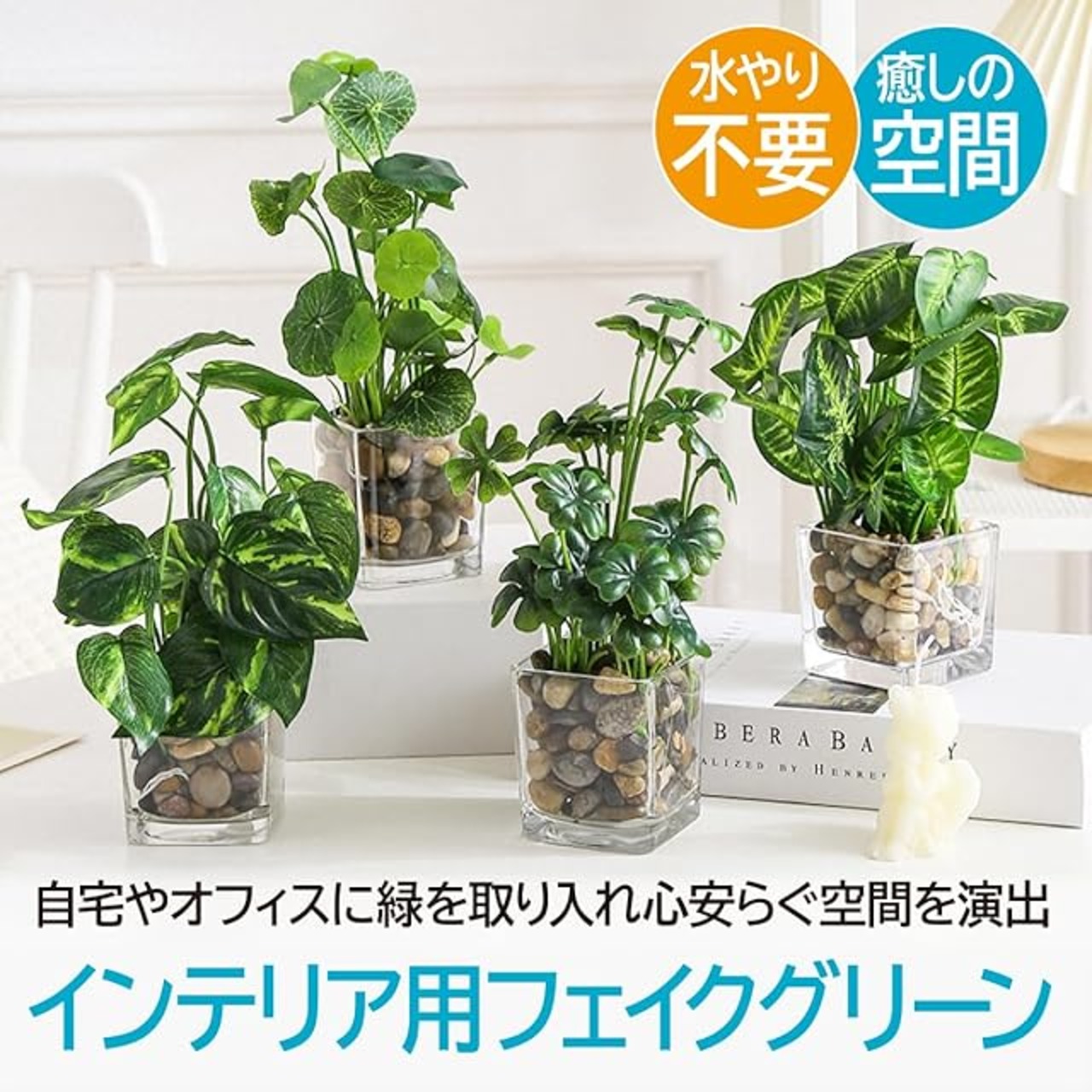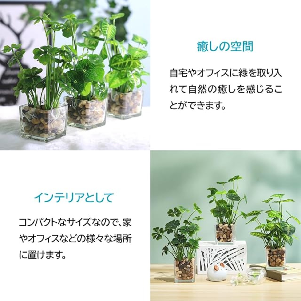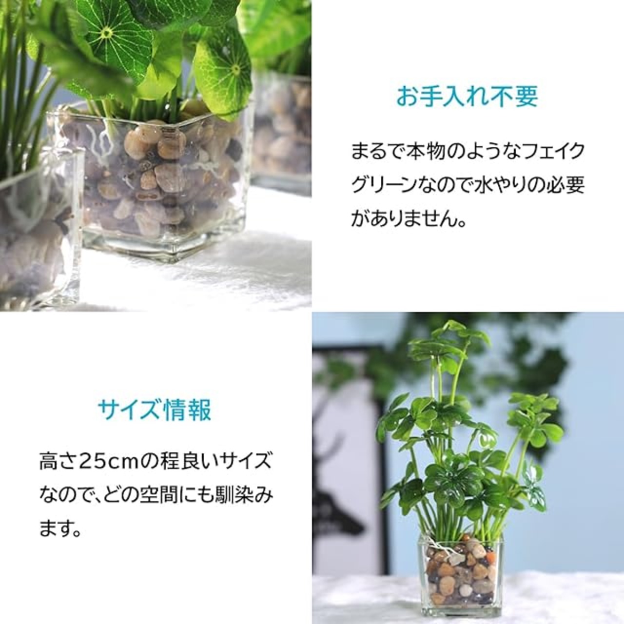 自宅やオフィスに緑を取り入れて、自然の癒しを感じることができます。<BR> コンパクトなサイズで、お部屋を明るく彩ります。<BR> 高さ25cmの適度な大きさで、どの空間にも馴染みます。<BR> 【仕様】サイズ:高さ25cm / 重量:0.54kg / 材質:ガラス、石、プラスチック / タイプ:四つ葉のクローバー ※モニターの環境により、色の見え方に若干差が生じる場合がございます。<br> ENN LLCは、当社オリジナルパッケージにてお送りし、30日の返品で安心して購入いただけます。