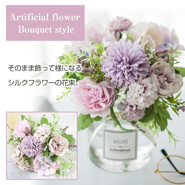 Kugusa 造花 インテリア ブーケ 花瓶付き セット 花束 フェイク パステル 装飾 花 アーティフィシャルフラワー (花瓶付きブーケ(パープル))