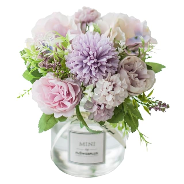 *工場を変更しました。お客様の声を元に、花瓶のサイズに合わせて茎がカットされた状態に、花瓶には紐ではなくリボンをつけました。 そのまま花瓶に生けて様になる造花の花束です。優しい色合いのものを集めました。インテリアの一部としてご利用いただけます。花のある暮らしをお楽しみください。