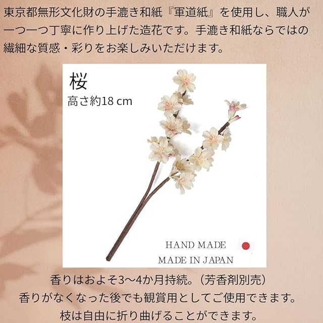 【手漉き和紙の美しさ】 東京都無形文化財の手漉き和紙『軍道紙』を使用し、職人が一つ一つ丁寧に作り上げた造花です。手漉き和紙ならではの繊細な質感・彩りをお楽しみいただけます。