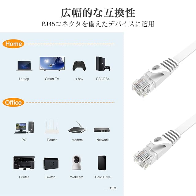 フラットタイプデザイン:超フラットタイプのLANケーブルのデザインで、カーペットの下やドア、すき間にしっかり配線できます。ランケーブルは非常に柔軟で、スムースながら頑丈で、壁に沿って並ぶのが簡単で、従来の丸型LANケーブルより美しく、狭い場所への配線に最適です。